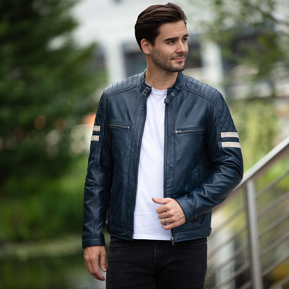 Leather Biker Jacket with Bold Contrasting Stripe Navy: AWM-NOVA