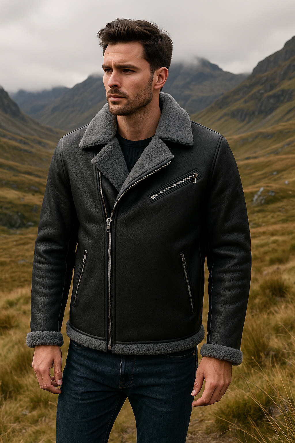 Men’s Side Zip Sheepskin Pilot Jacket – Black B9 Bomber